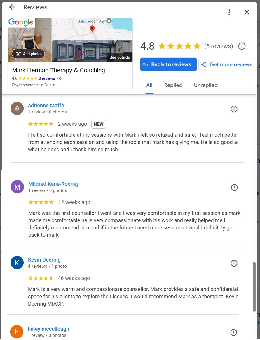 – DECEMBER 2025: Immediate therapy appointments in Howth newly available on Mondays. May suit people with kids at school, those who WFH or on shift or retirees. Limited immediate availability also on other days in Fairview, Howth and online.
